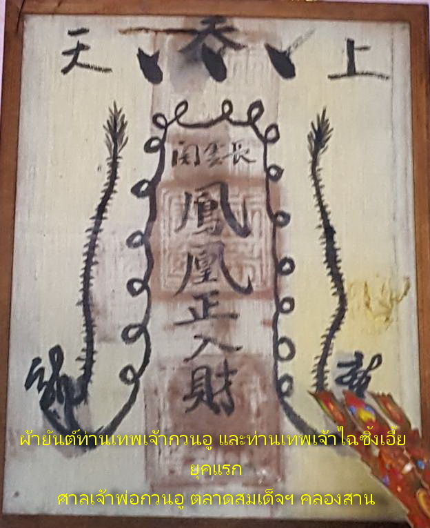 กับสุดยอดตำนาน “ผ้ายันต์อากงท่านเทพเจ้ากวนอู และท่านเทพเจ้าไฉซิ้งเอี้ย” ยุคต้น หรือยุคดั้งเดิม และ “ผ้ายันต์ลุยไฟโค้วโต่วฮู้” (ผ้ายันต์ผูกเอว หรือคาดเอว) ยุคต้น หรือยุคดั้งเดิม ขององค์อากงท่านเทพเจ้ากวนอู ศาลเจ้าพ่อกวนอู บริเวณชุมชนชาวตลาดสมเด็จเจ้าพระยา คลองสาน ที่เคยโด่งดังมากๆ ในยุคของอาเหล่าแปะ หรือ “จับเกี๊ยมแปะ” (หรือที่คนในบริเวณชุมชนชาวตลาดสมเด็จเจ้าพระยาจะรู้จักกันในนามว่า “จับเกี๊ยมแปะ”) ซึ่งท่านมีองค์ประทับขององค์อากงท่าน “เทพเจ้ากวนอู” และเคยมีการประทับทรงองค์อากงท่าน “เทพเจ้ากวนอู” ภายในศาลเจ้าพ่อกวนอู บริเวณชุมชนชาวตลาดสมเด็จเจ้าพระยา คลองสาน ในช่วงหลายสิบปีก่อน