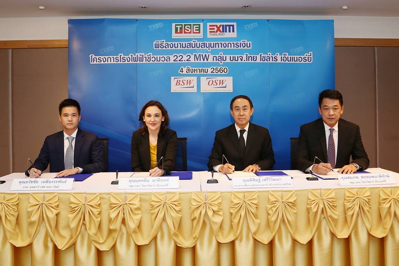 นายพิศิษฐ์ เสรีวิวัฒนา กรรมการผู้จัดการ ธนาคารเพื่อการส่งออกและนำเข้าแห่งประเทศไทย (EXIM BANK) ร่วมลงนามกับนางสาวแคทลีน มาลีนนท์ และนายสมภพ พรหมพนาพิทักษ์ กรรมการ บริษัท ออสการ์ เซฟ เดอะ เวิลด์ จำกัด และบริษัท บางสวรรค์ กรีน จำกัด และนายธวัชชัย เหลืองวรพันธ์ กรรมการ บริษัท ออสการ์ เซฟ เดอะ เวิลด์ จำกัด ซึ่งเป็นบริษัทในกลุ่ม บริษัท ไทย โซล่าร์ เอ็นเนอร์ยี่ จำกัด (มหาชน) ในสัญญาสนับสนุนทางการเงินของ EXIM BANK จำนวนรวม 2,257.50 ล้านบาท เพื่อให้บริษัทนำไปใช้ในการก่อสร้างโรงไฟฟ้าชีวมวลจำนวน 3 โครงการในจังหวัดสุราษฎร์ธานีและนครศรีธรรมราช กำลังการผลิตรวม 22.2 เมกะวัตต์ (MW) โดยมีการไฟฟ้าส่วนภูมิภาคเป็นผู้รับซื้อ ณ EXIM BANK สำนักงานใหญ่ เมื่อเร็วๆ นี้